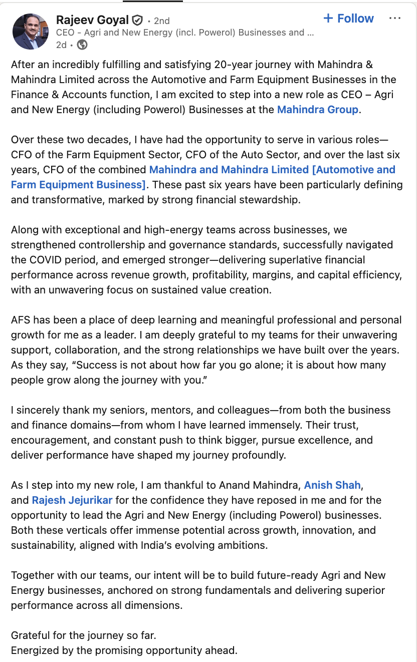 In his post, Goyal acknowledged senior leadership at the Mahindra Group, including Chairman Anand Mahindra and CEO Anish Shah, along with automotive executive Rajesh Jejurikar, thanking them for their support and confidence in his appointment.