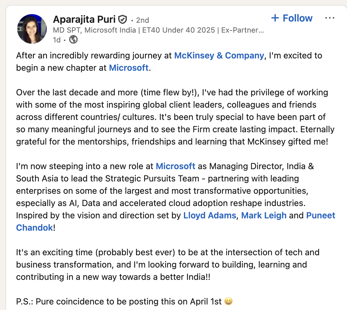 Confirming the move on LinkedIn, Puri described her time at McKinsey as “incredibly rewarding”, highlighting her work across industries and geographies, as well as the professional relationships and learning that shaped her career.