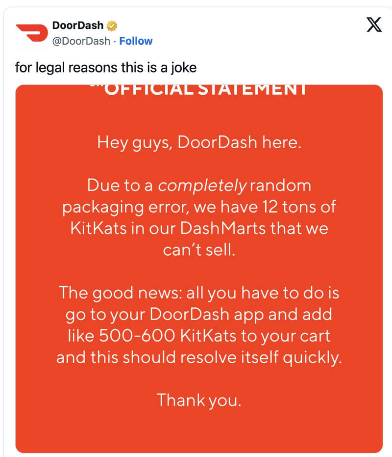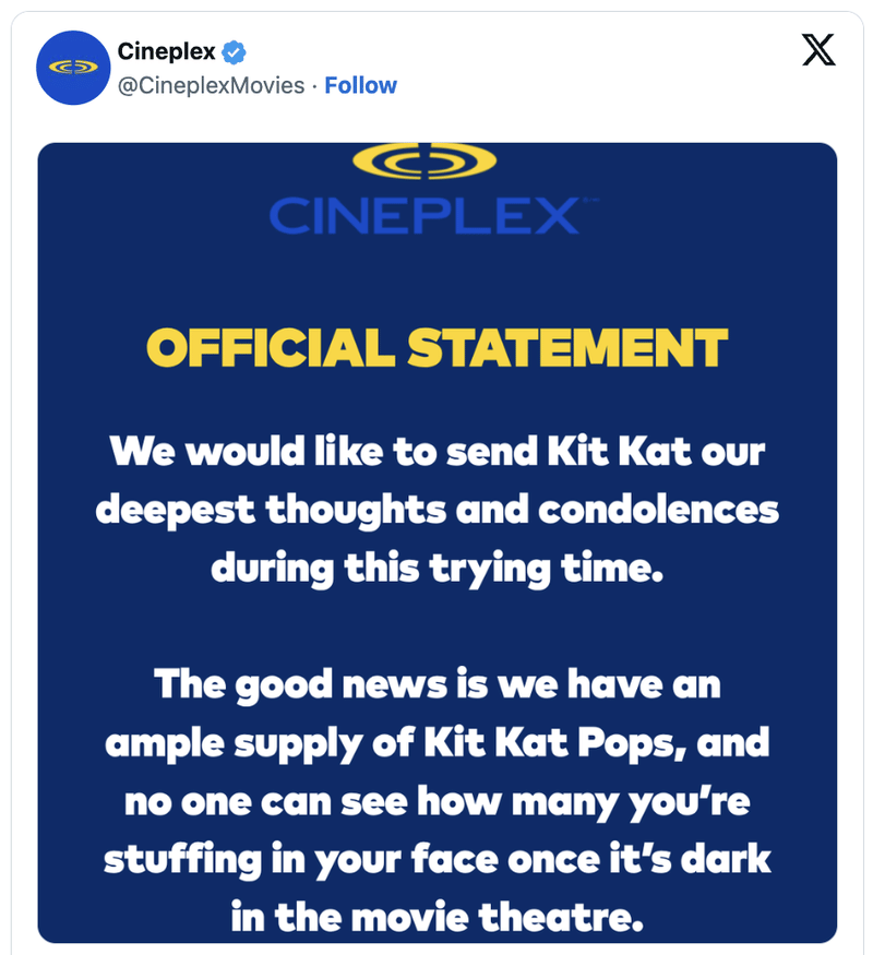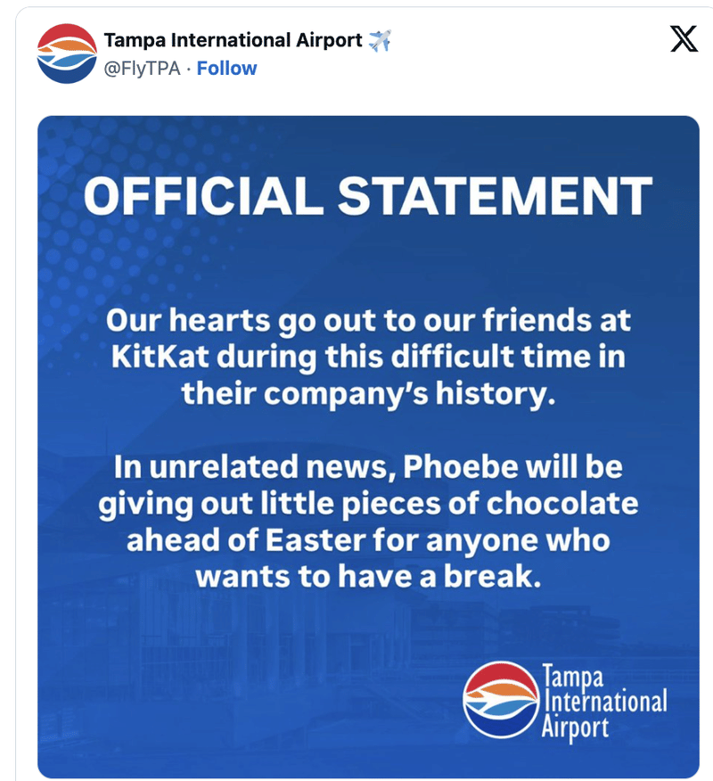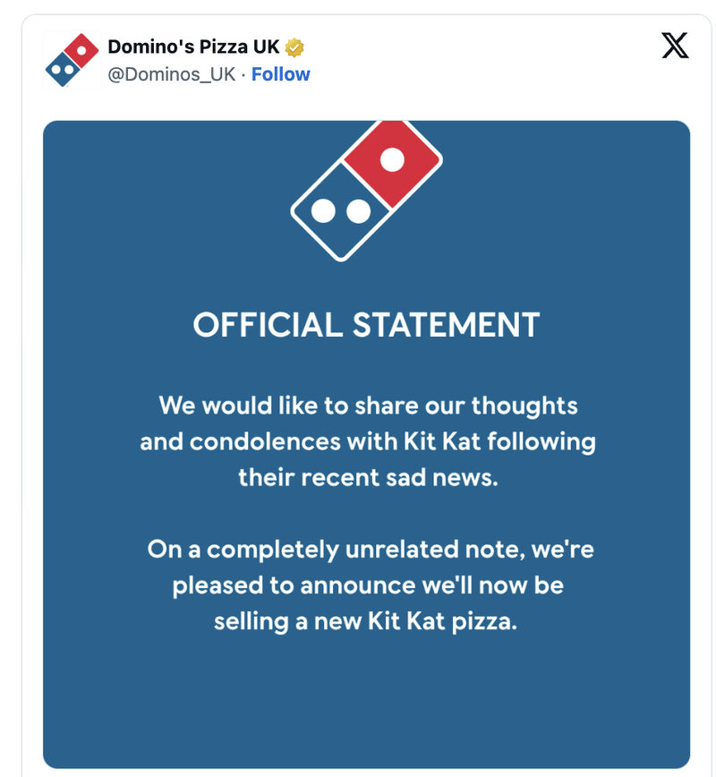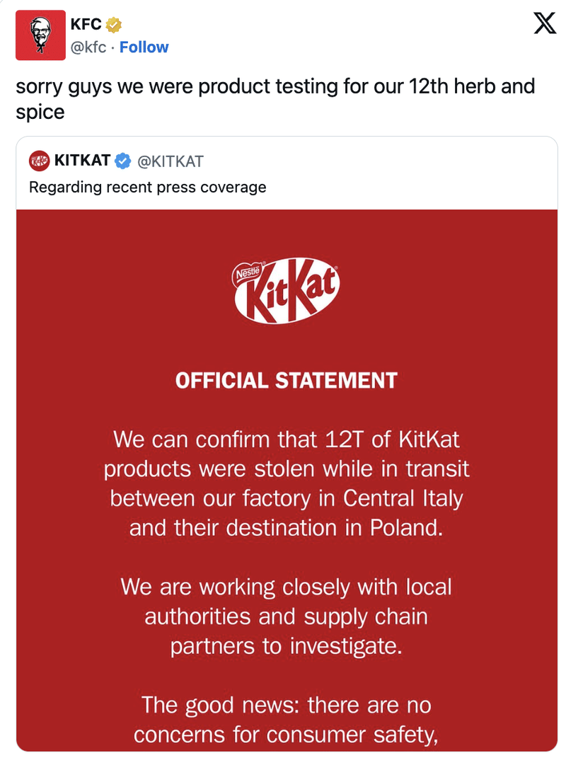 Domino’s Pizza UK announced, tongue firmly in cheek, a “new KitKat pizza”, while KFC added to the banter, saying it was merely “product testing for our 12th herb and spice." Ryanair posted an AI-generated image of a plane that appears to be stuffed with chocolate bars.