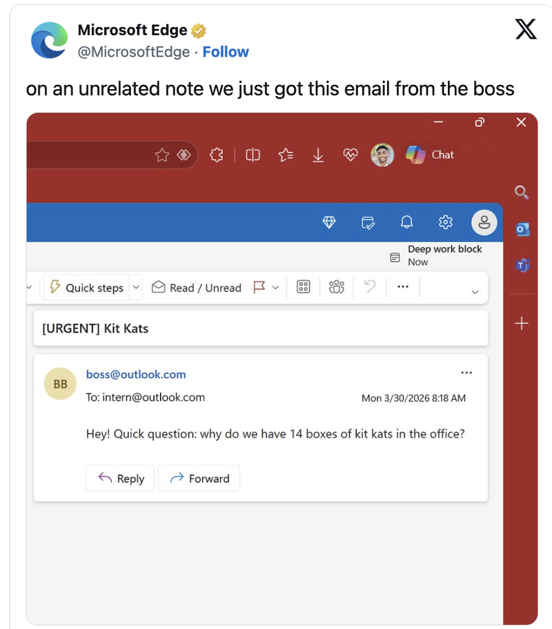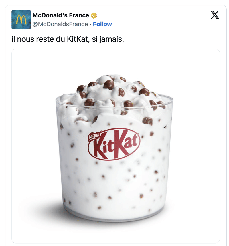 Microsoft Edge posted an internal email asking why there were unexpected boxes of KitKat in the office. McDonald’s France, on the other hand, shared a dessert image, hinting it still had stock “just in case”.