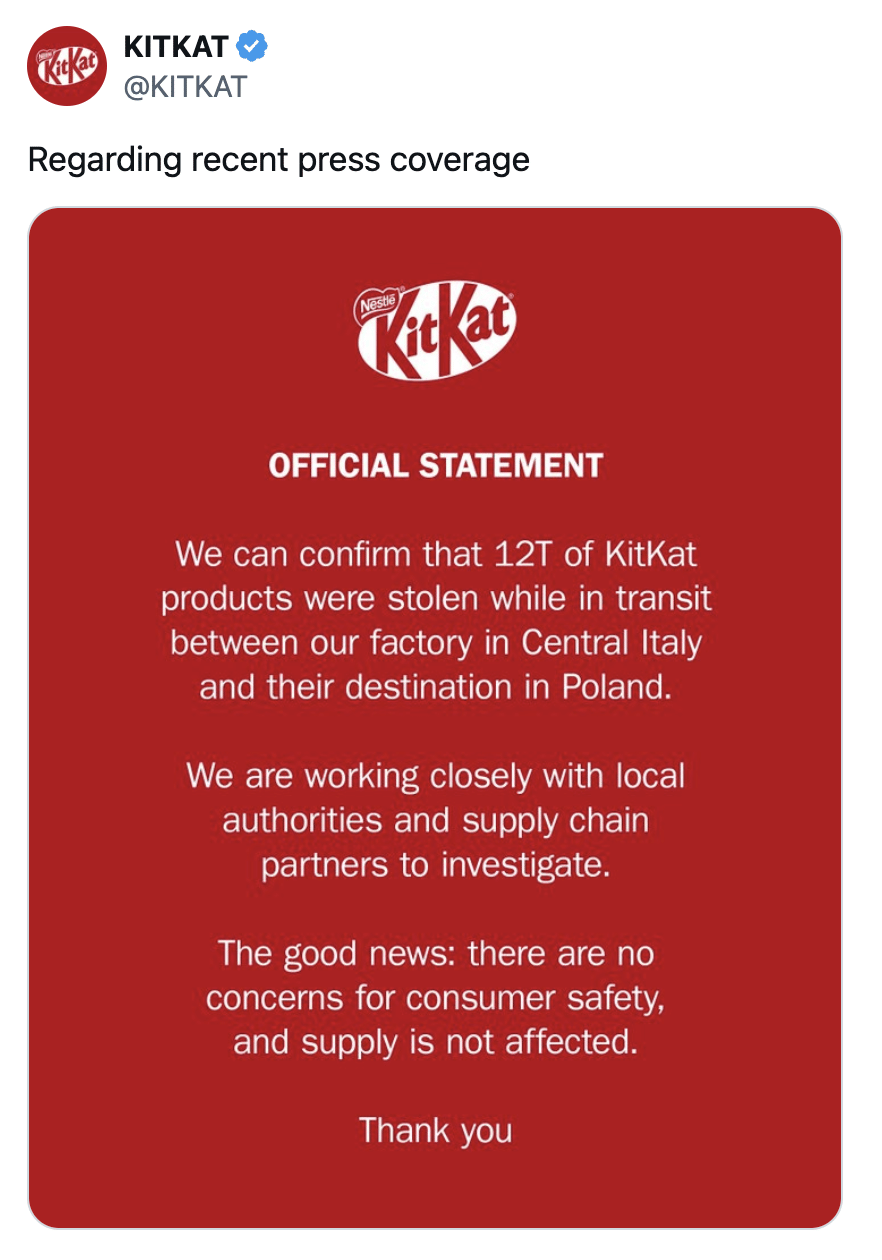 “We’ve always encouraged people to have a break with KitKat—but it seems thieves have taken the message too literally,” a company spokesperson said, adding that cargo theft is becoming an escalating issue for businesses.