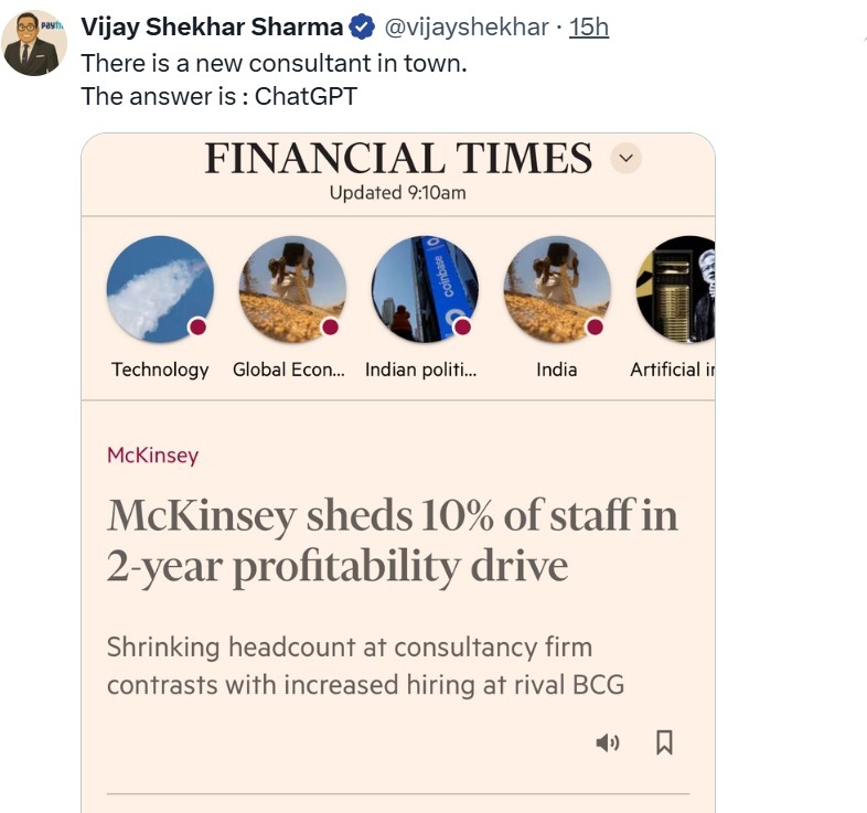 Amid growing chatter around job cuts at leading consulting firm McKinsey & Company, Paytm Founder and CEO Vijay Shekhar Sharma took a satirical swipe, pointing to the rising influence of artificial intelligence. Sharing a snippet from a Financial Times article that claimed McKinsey had reduced its global workforce by over 5,000 in the past 18 months, Sharma posted on X (formerly Twitter), “There is a new consultant in town. The answer is: ChatGPT.”