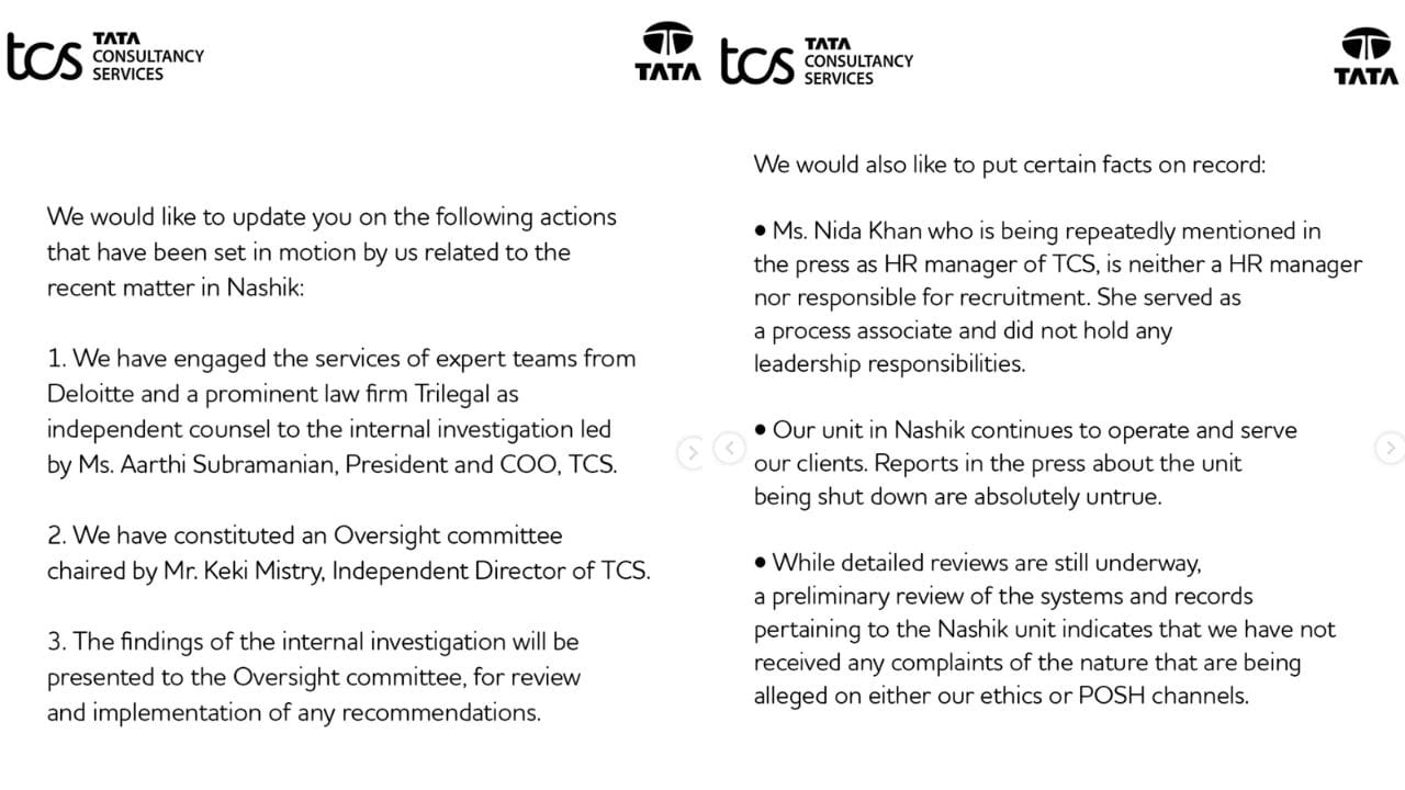 Tata Consultancy Services has issued a detailed statement outlining the structure of its internal investigation into the Nashik case, clarifying that Nida Khan did not hold any human resources role and setting out a multi-layered review led by senior leadership with external oversight.