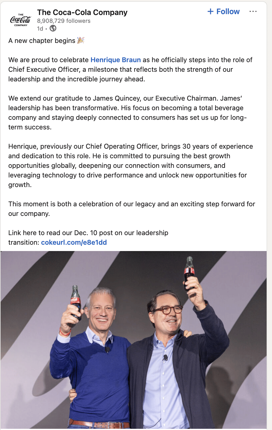 Former COO Henrique Braun takes charge as CEO, while James Quincey transitions to executive chairman role.