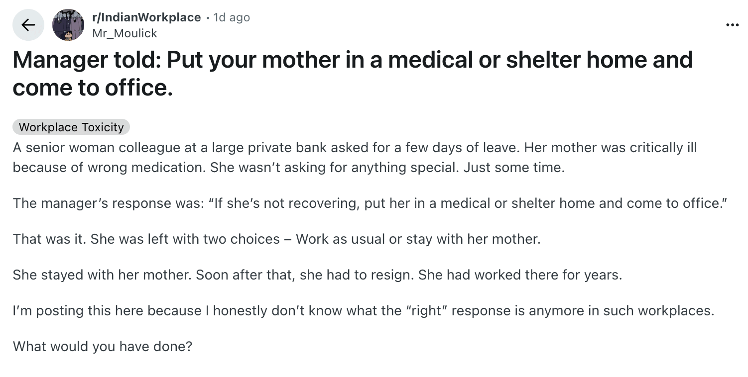 The allegation surfaced on the r/IndianWorkplace subreddit, where a user identified as Mr_Moulick said the employee had sought a few days of leave after her mother’s condition worsened due to incorrect medication. The request, the post claimed, was met with a response that left the employee with a stark choice.