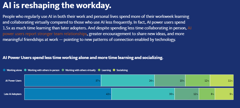 The findings reveal that AI is reshaping the workday in ways that amplify human interaction rather than replace it. AI Power Users spend 37% of their workweek alone, compared to 42% for late adopters, and dedicate more time to learning (12% vs. 8%) and socialising (11% vs. 9%).