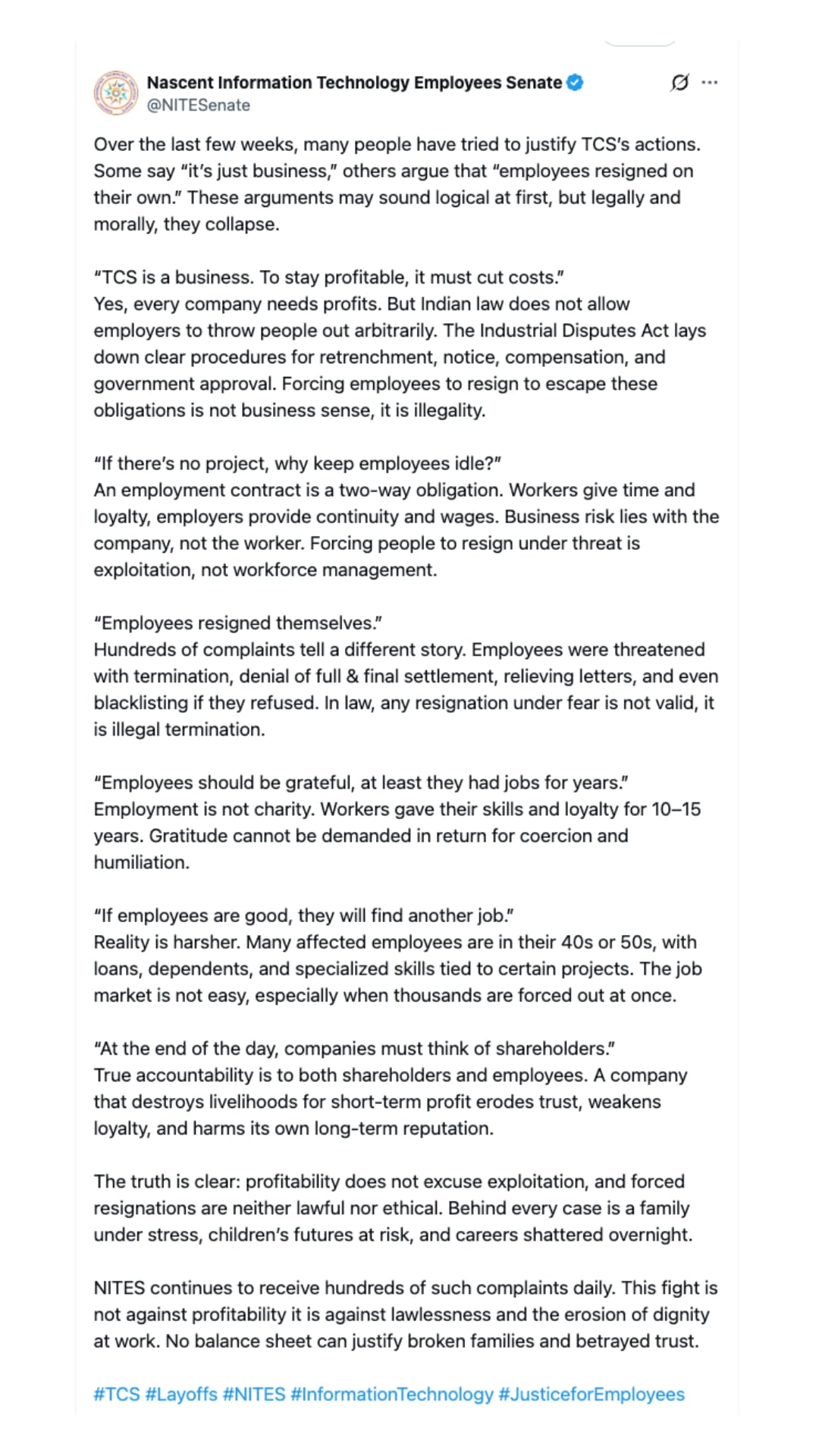 “Over the last few weeks, many people have tried to justify TCS’s actions. These arguments may sound logical at first, but legally and morally, they collapse,” NITES said in its post.